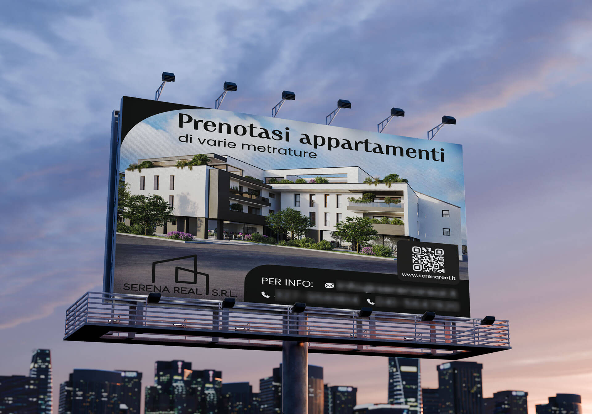 Abbiamo ideato un cartellone pubblicitario di grandi dimensioni che unisce un render architettonico di forte impatto a una grafica pulita e istituzionale.