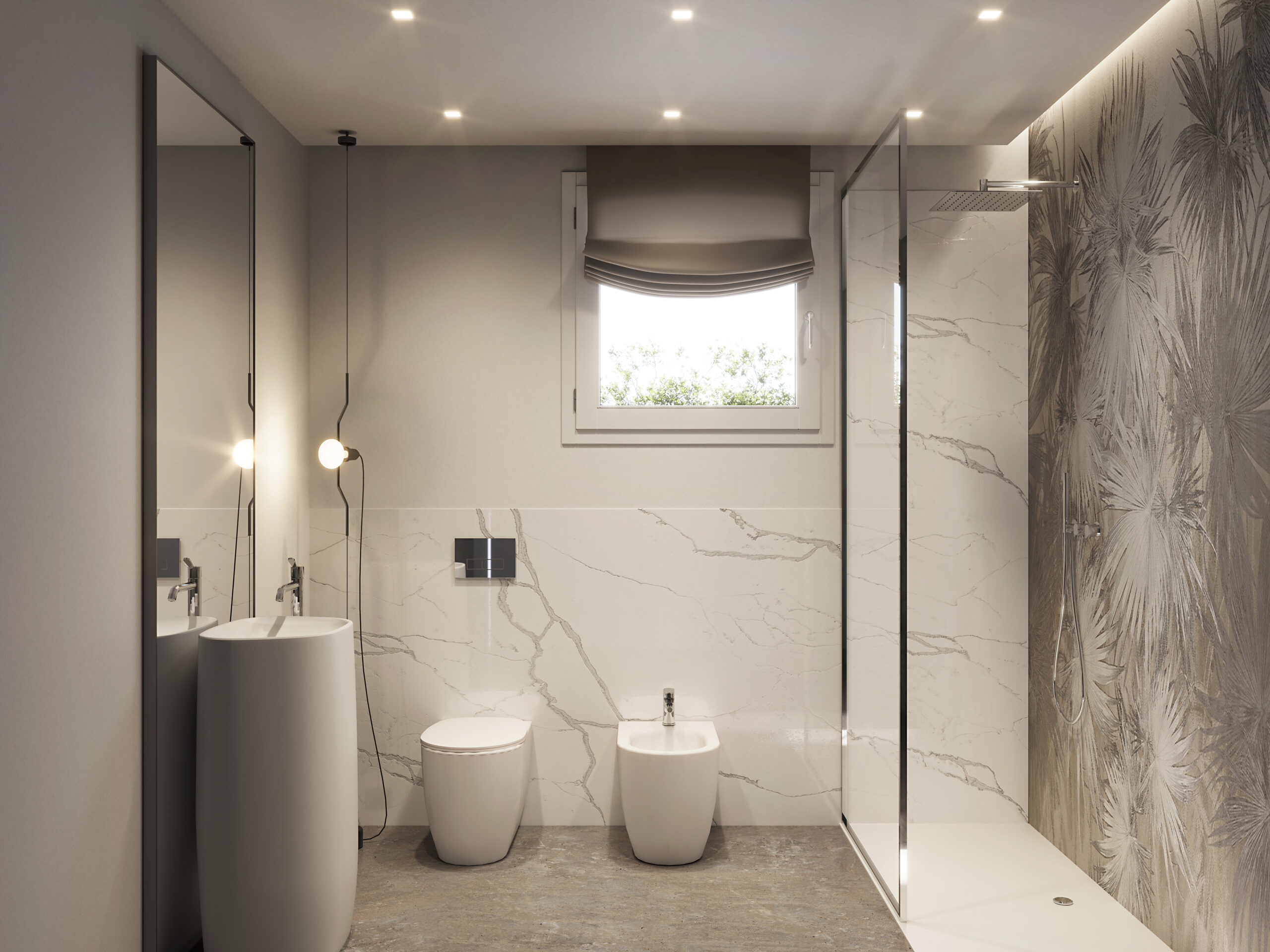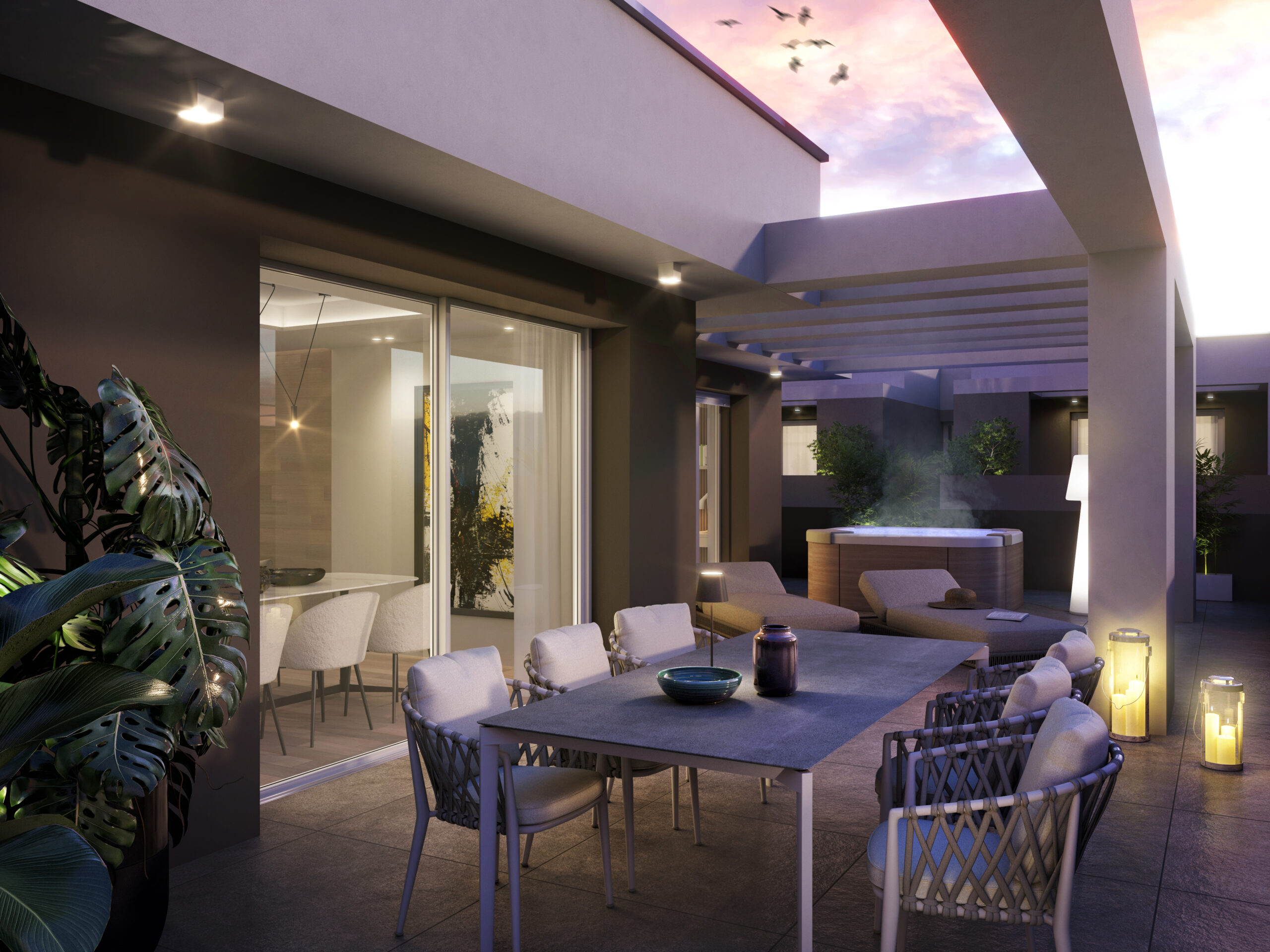 Nei nostri Render Interni fotorealistici inseriamo perfettamente il contesto reale fotografato sul posto, la vista incontra il panorama esistente fuori dalle finestre e oltre le terrazze.
