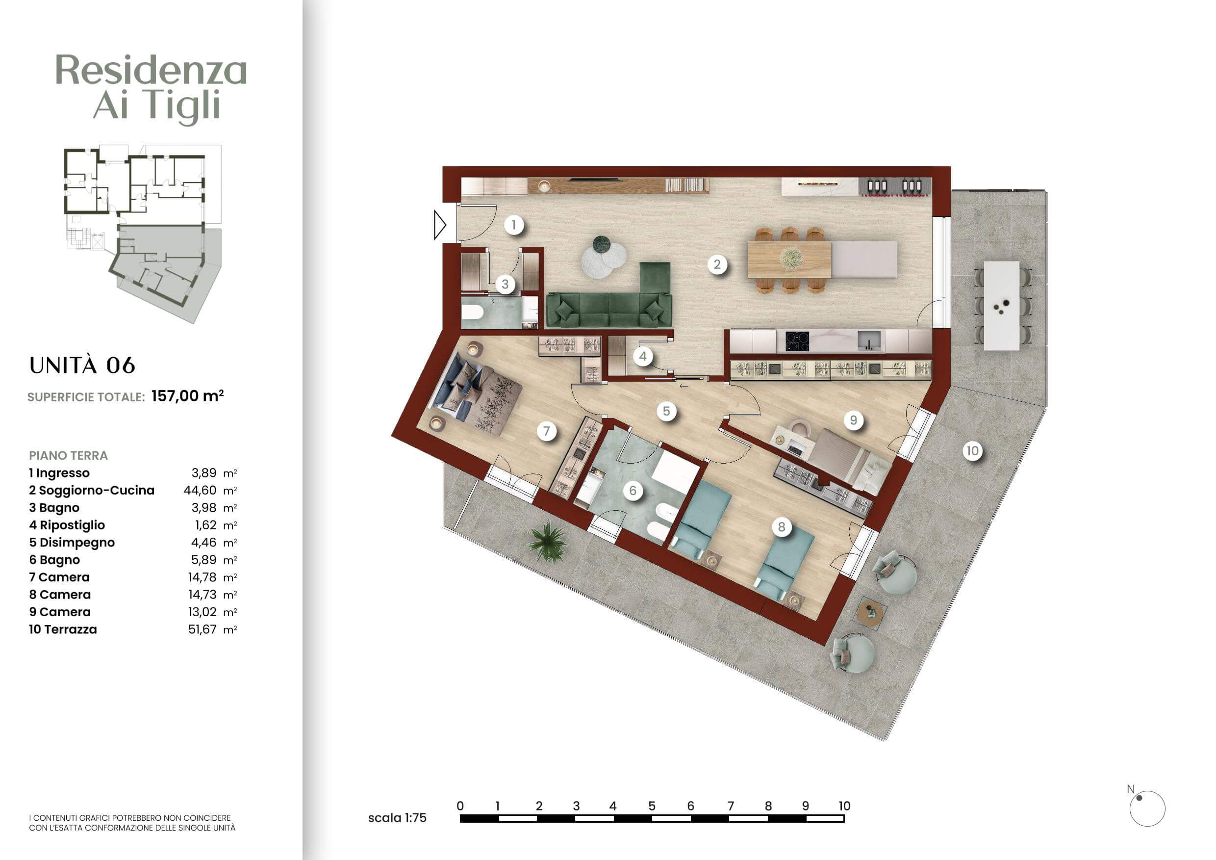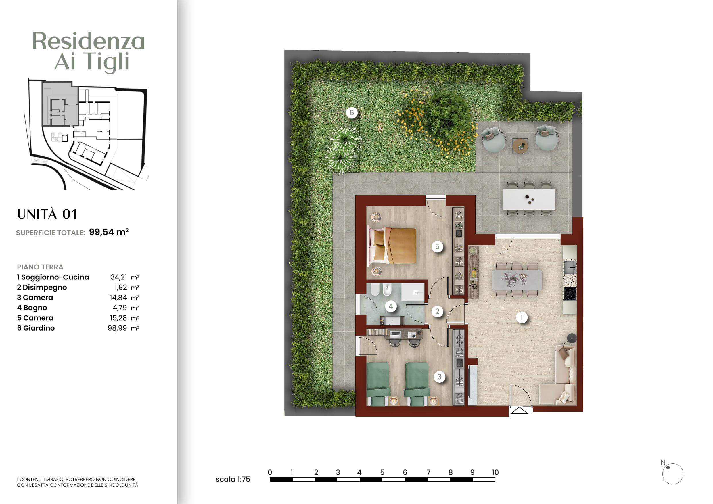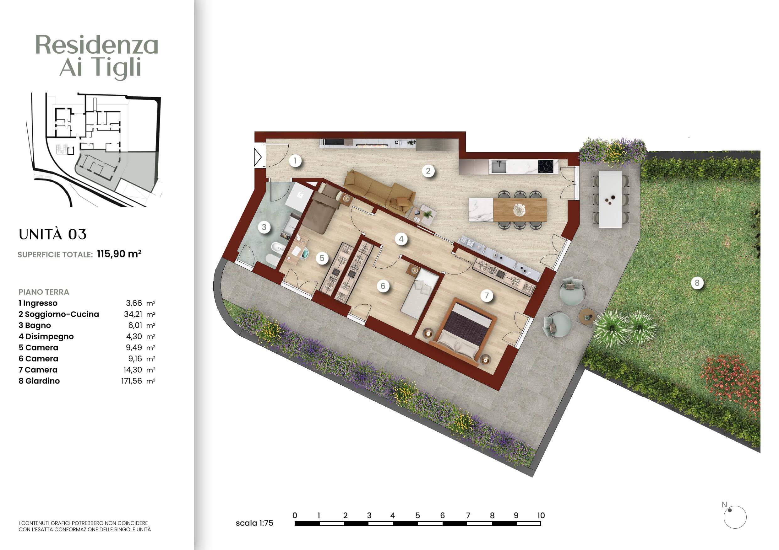 Ogni pagina combina immagini tratte dai nostri render fotorealistici con testi concisi che descrivono la posizione, le soluzioni abitative e le caratteristiche tecniche dell’intervento. Le planimetrie arredate offrono una visione chiara e funzionale degli spazi, facilitando la comprensione del layout e delle potenzialità di personalizzazione degli ambienti.