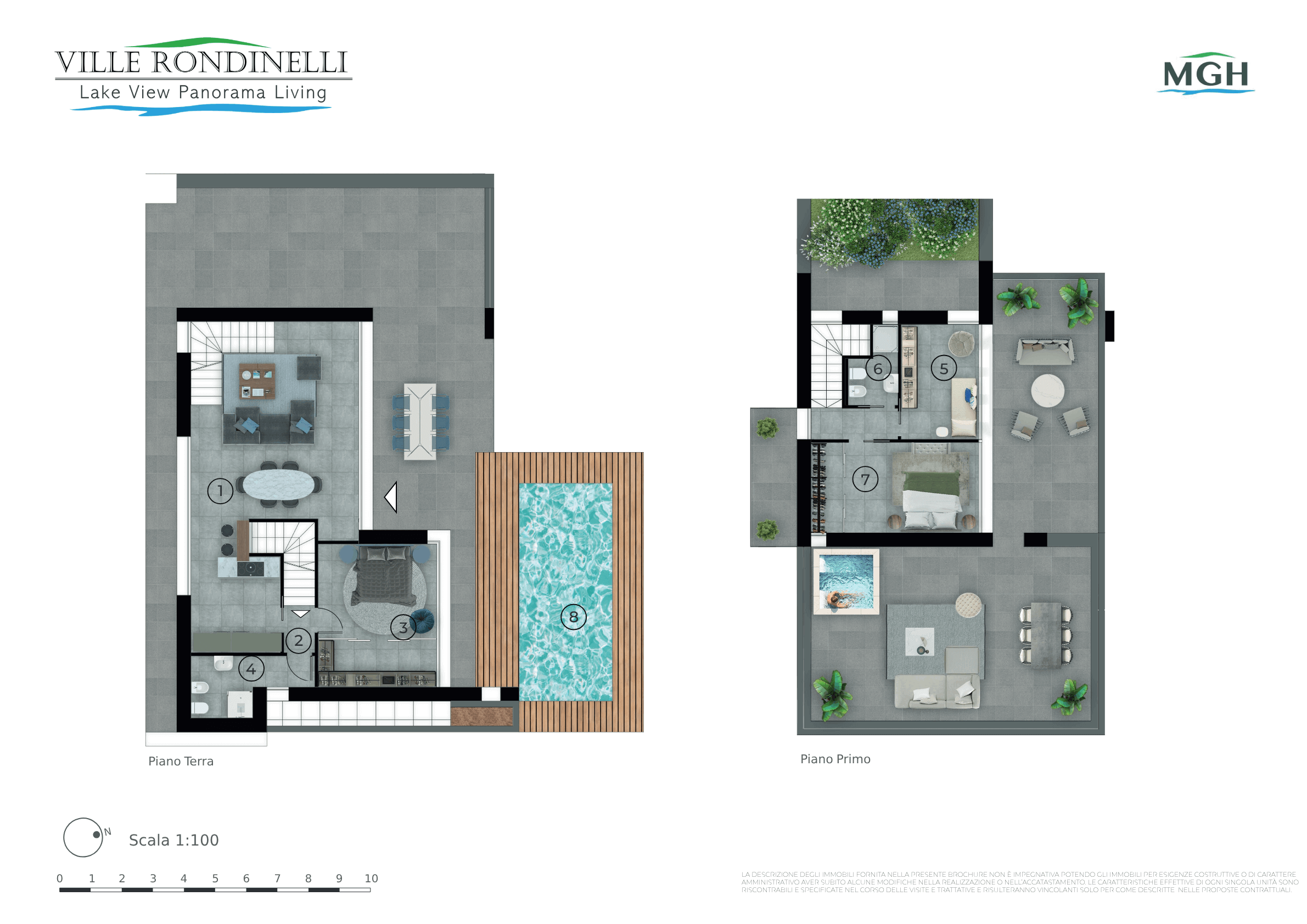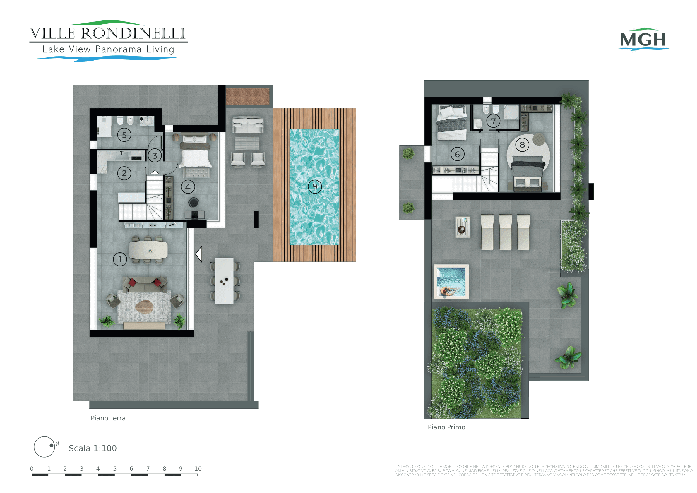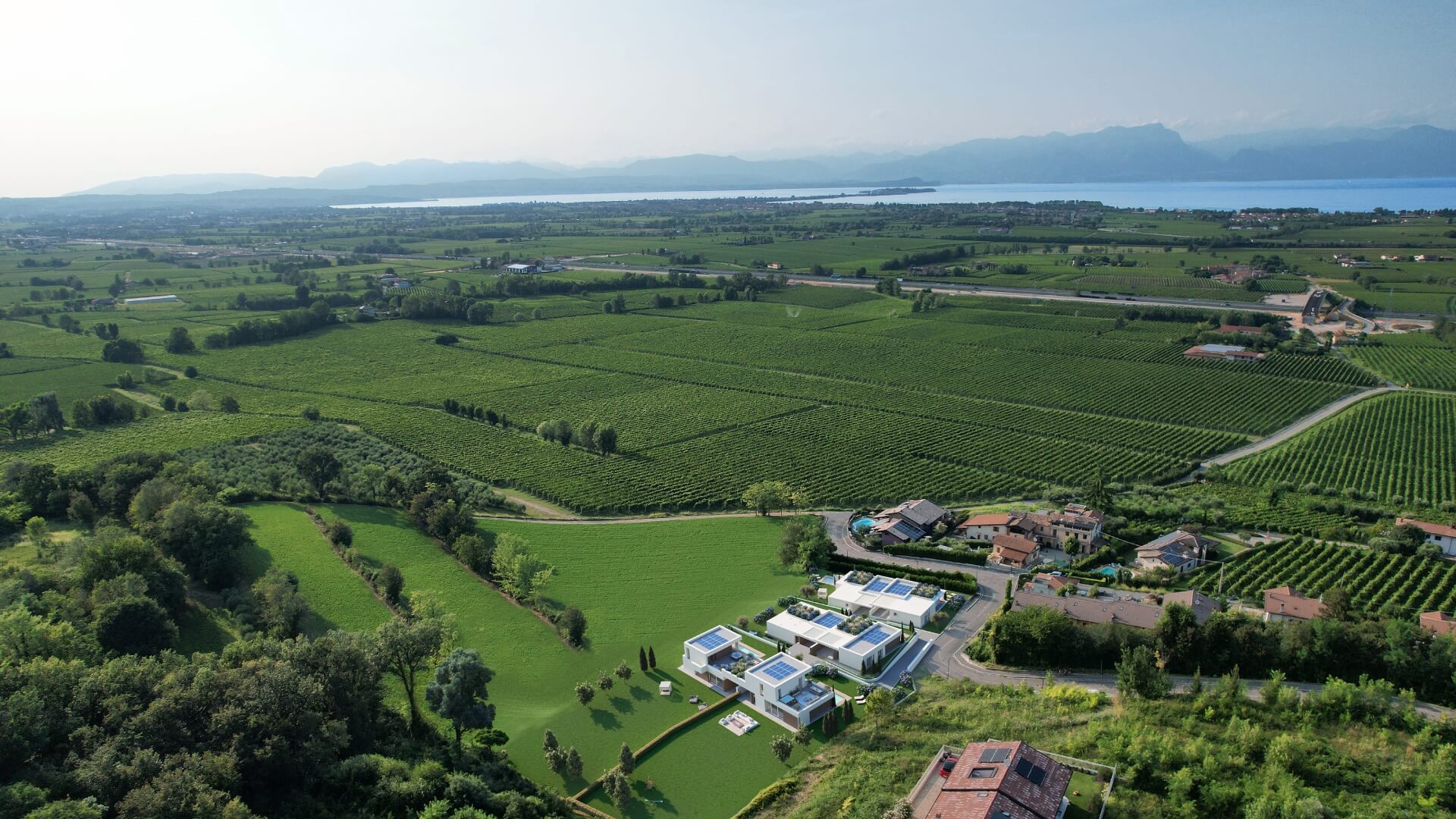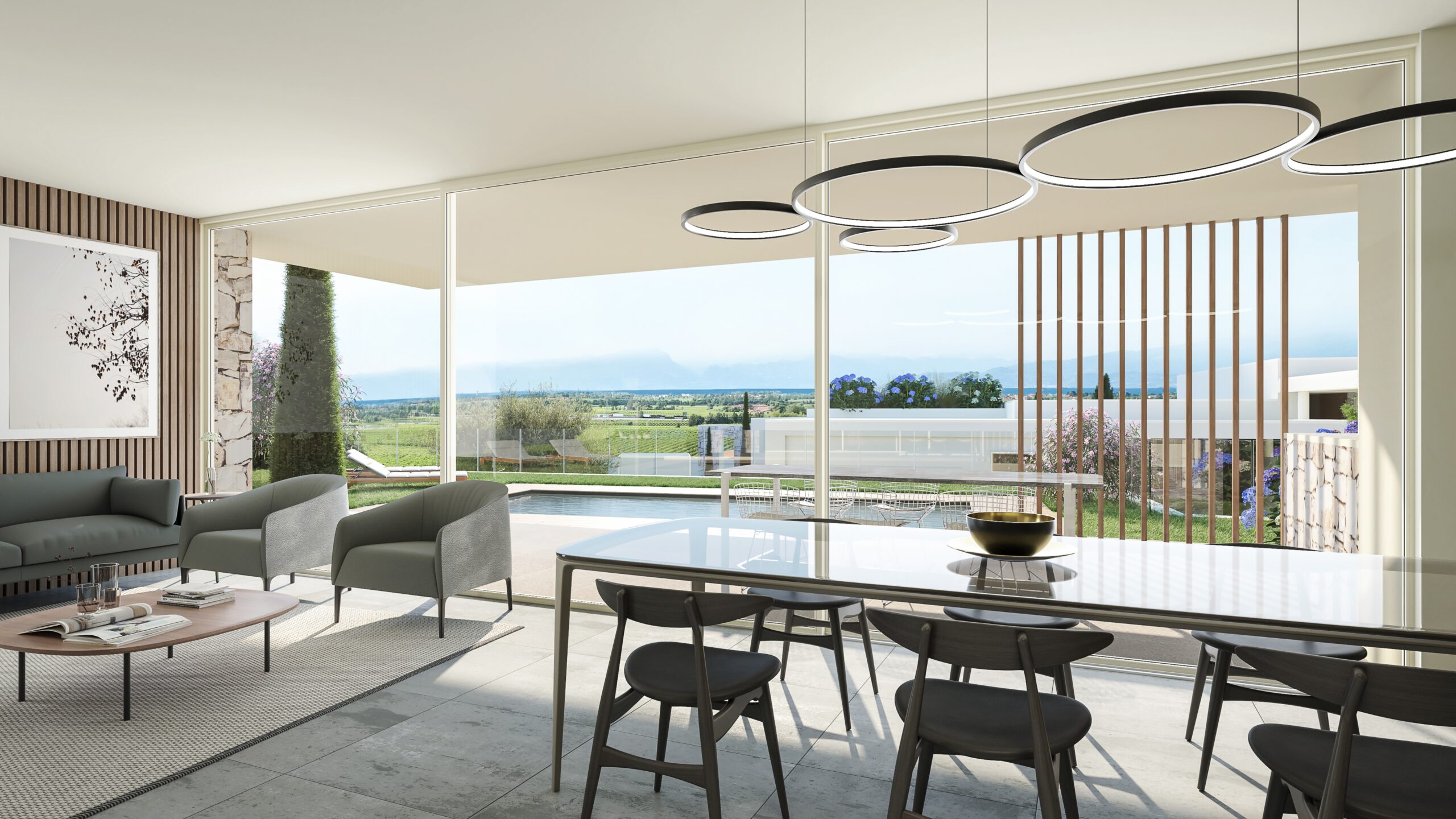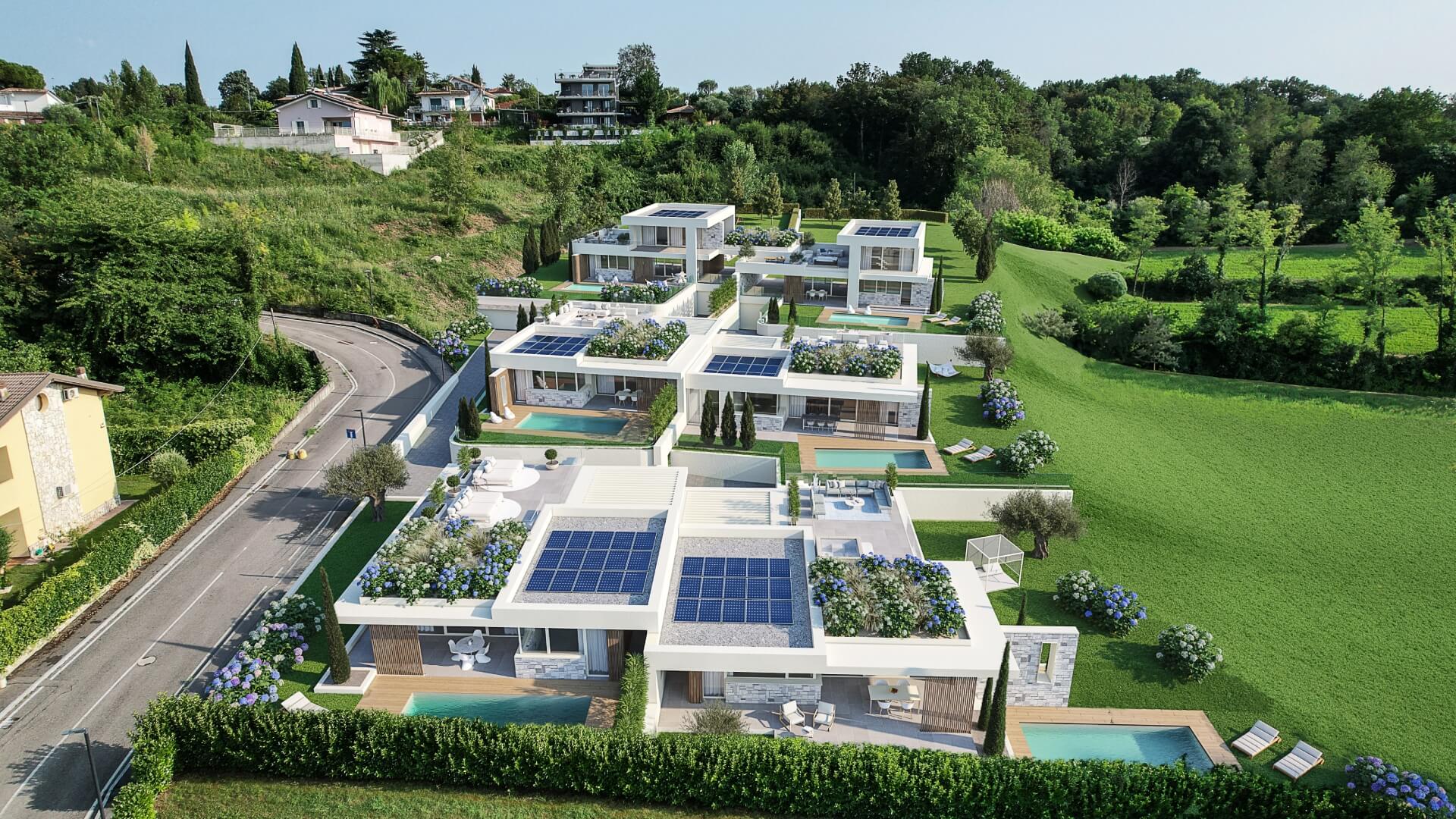 Immerso nella bellezza naturale di Peschiera del Garda, il progetto Ville Rondinelli è composto da sei ville di nuova costruzione, questo complesso combina un design moderno con materiali pregiati, come le facciate in pietra della Valpolicella e i rivestimenti effetto legno, che si fondono perfettamente con l’ambiente circostante. Ogni villa offre spazi esterni lussuosi con piscine private, porticati coperti e terrazze solarium con vista sul Lago di Garda.